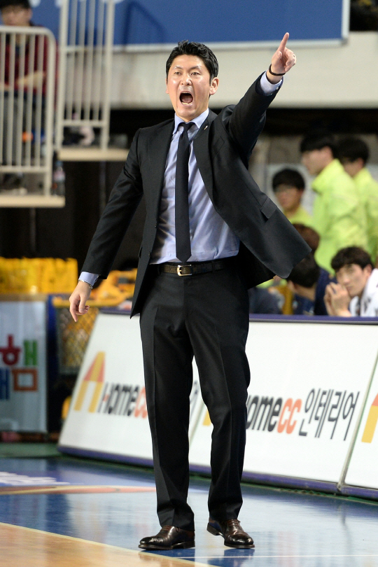 추승균 전주 KCC 감독이 22일 창원 LG전 도중 코트의 선수들에게 움직임을 지시하고 있다. 사진=KBL