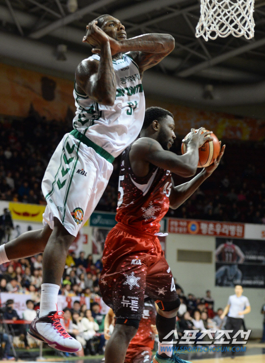 2015-2016 프로농구 안양KGC와 원주동부의 경기가 6일 안양실내체육관에서 열렸다. 동부 맥키네스와 KGC 마리오와 리바운드 경합을 벌이고 있다. 얀양=최문영 기자 deer@sportschosun.com /2015.12.06 / |