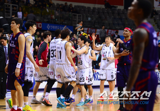13일 오후 경기도 고양시 고양체육관에서 프로농구 고양 오리온스와 창원 LG의 경기가 열렸다. 창원 LG가 고양 오리온스에 75-74로 짜릿한 역전승을 거뒀다. 경기 종료 후 환호하고 있는 창원 LG 선수들. 고양=송정헌 기자 songs@sportschosun.com/2015.12.13 |