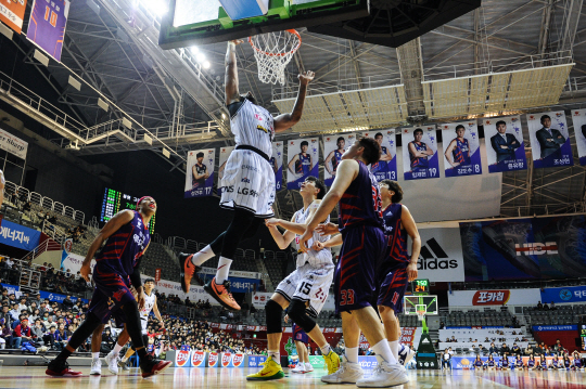 창원 LG 세이커스의 외국인 선수 트로이 길렌워터가 13일 고양 오리온 오리온스전에서 골밑슛을 시도하고 있다. 사진제공=KBL