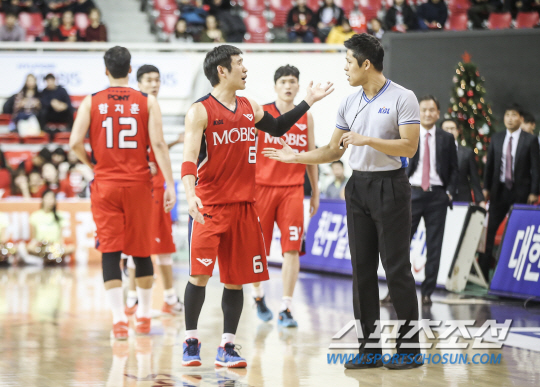 잇단 테크니컬을 받은 모비스. 주장 양동근이 박범재 심판에게 항의하고 있다. 사진제공=KBL