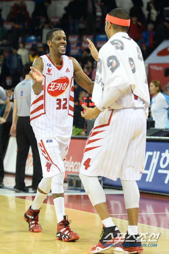 2015-2016 프로농구 서울SK와 고양오리온의 경기가 12일 서울 잠실학생체육관에서 열렸다. 오리온의 헤인즈가 SK를 상대로 승리를 확정짓고 문태종과 환호하고 있다. 잠실=최문영 기자 deer@sportschosun.com /2015.11.12/ |