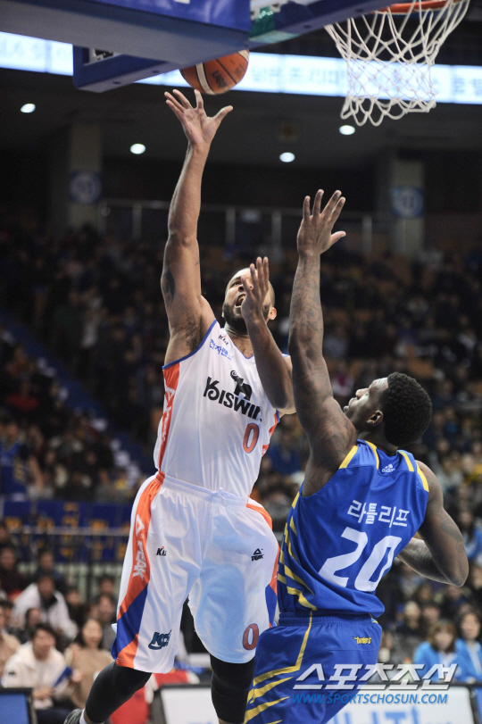 전자랜드 자멜 콘리가 삼성 리카르도 라틀리프를 제치고 골밑슛을 시도하고 있다. 사진제공=KBL