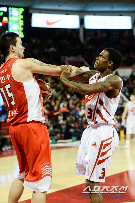 ◇오리온 외국인 단신 가드 조 잭슨(오른쪽)이 25일 서울 잠실 학생체육관에서 열린 SK와의 경기에서 폭력을 휘둘렀다. 잭슨은 경기 종료 3초전 SK 김민수와 리바운드를 다투다 화를 내며 주먹질을 해 퇴장당했다. 이에 앞서 잭슨은 동점 상황이던 2분10여초 전 쓸데없이 덩크슛을 시도하다 실패하며 팀패배의 결정적 원인을 제공하고 말았다. 사진=KBL 제공