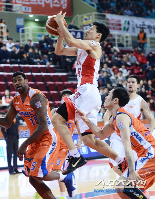 인천 전자랜드와 서울 SK의 프로농구 경기가 31일 인천 삼산체육관에서 열렸다. SK 김선형이 레이업슛을 시도했지만 전자랜드 박성진의 파울에 막혀 공을 놓치고 있다. 전자랜드는 11승 24패로 9위, SK는 12승 23패로 8위를 달리고 있다. 정재근 기자 cjg@sportschosun.com/2015.12.31/