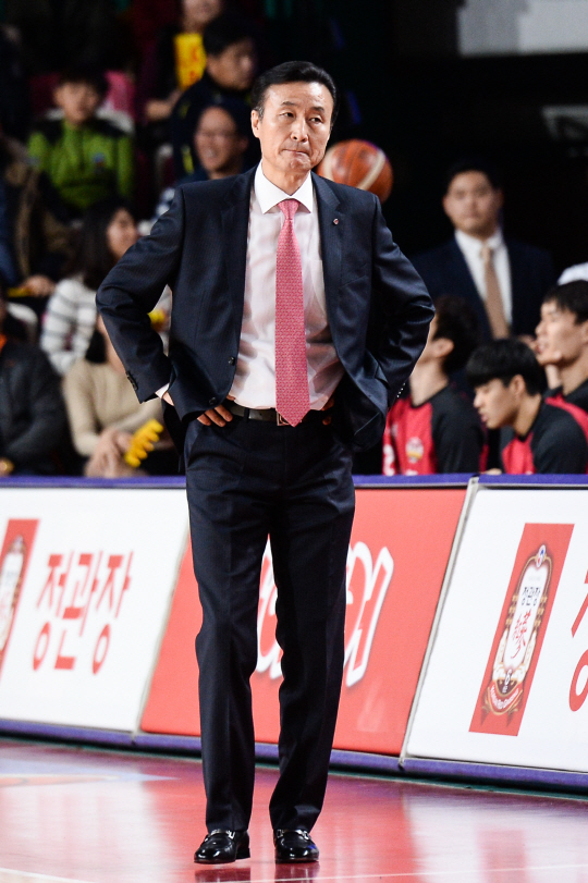 | 김 진 창원 LG 감독이 14일 열린 고양 오리온전을 벤치 앞에서 지켜보고 있다. 사진제공=KBL |