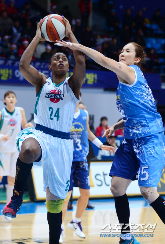 신한은행과 KEB하나은행의 여자프로농구 경기가 21일 인천 도원체육관에서 열렸다. KEB하나은행 휴스턴이 신한은행 신정자의 수비를 제치며 골밑슛을 시도하고 있다. 신한은행과 KEB하나은행은 8승 6패로 공동 2위를 달리고 있다. 인천=정재근 기자 cjg@sportschosun.com
