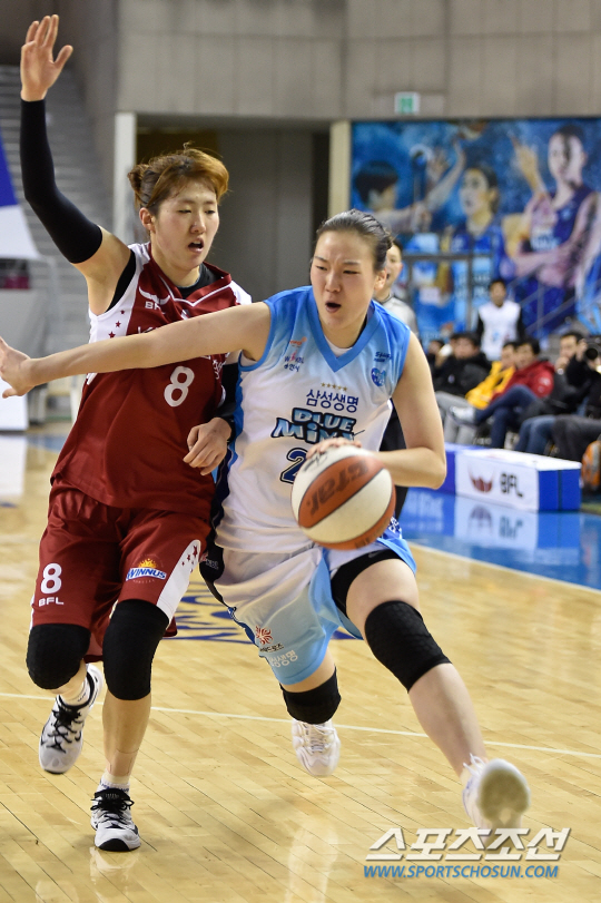 삼성생명 배혜윤(오른쪽)이 24일 용인실내체육관서 열린 'KDB생명 2015~2016 여자 프로농구' KDB생명전에서 KDB생명 노현지의 마크를 뚫고 드리블을 하고 있다. 사진제공=WKB