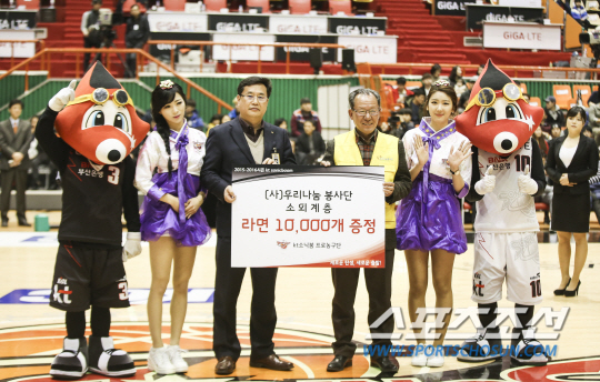 kt 소닉붐은 7일 KCC와의 경기 전 사단법인 우리나눔봉사단에 라면 1만개를 기부했다고 밝혔다. 부산지역 사회봉사의 일환으로 진행된 이번 행사는 kt 소닉붐이 홈경기 입장 수입의 2%를 적립해 마련한 사회공헌 재원을 활용했다.