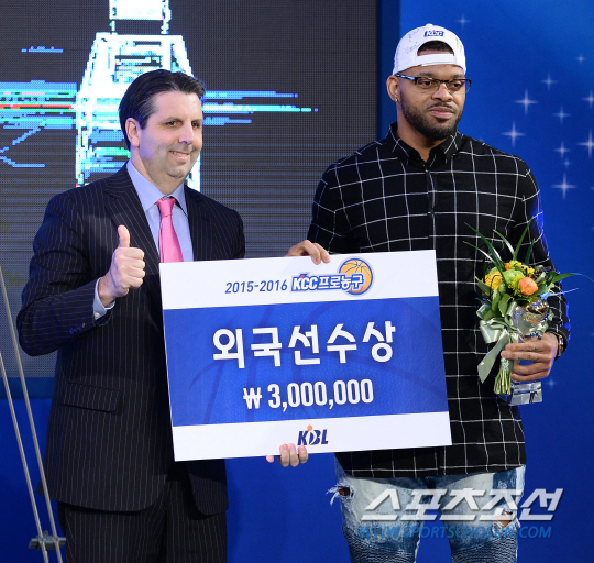 2015-2016 KCC프로농구 시상식이 22일 서울 반포동 JW메리어트호텔에서 열렸다. 최우수 외국인선수상을 수상한 KCC 에밋이 시상자로 나선 마크 리퍼트 주한 미대사와 함께 포즈를 취하고 있다. 정재근 기자 cjg@sportschosun.com