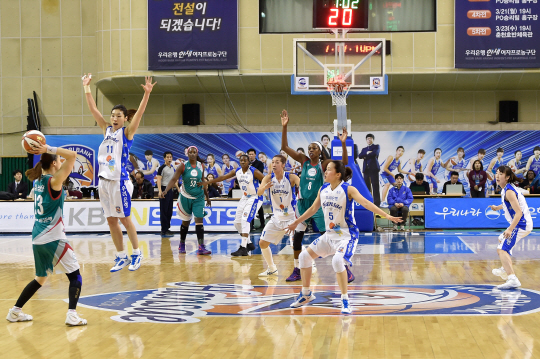 우리은행 한새는 16일 KEB하나은행과의 2015~2016시즌 KDB생명 여자농구 챔피언결정(5전 3선승제) 1차전에서 여유있게 66대51로 승리했다. 압도적인 경기력으로 첫판을 승리해 통합 우승 4연패에 한발짝 다가섰다.
