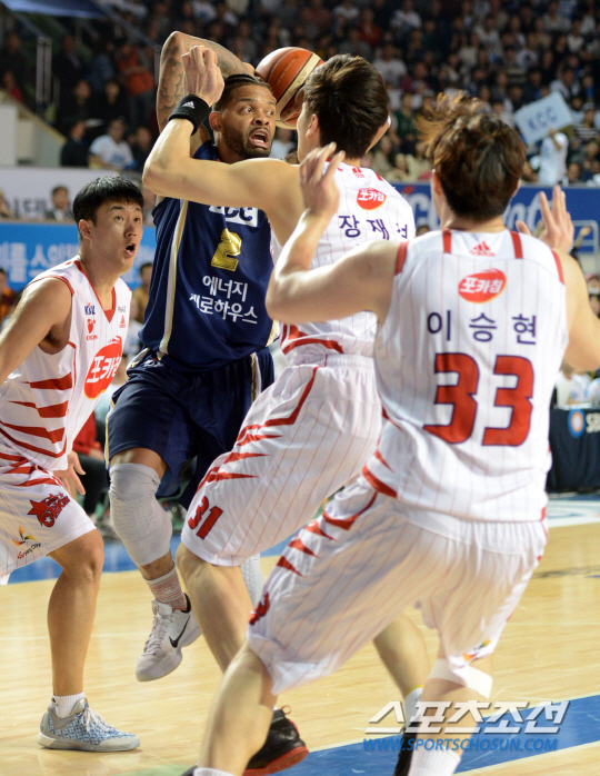 또 하나, KCC는 외곽수비에서부터 잭슨에게 슛 찬스를 어느 정도 제공했다. 어차피 골밑에는 하승진이 있다. 즉, 잭슨이 골밑을 돌파하더라도 미드 레인지 지역에서 슛을 쏠 수 밖에 없는 상황을 만들었다.