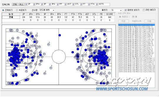 이 부분을 오리온은 이용했다. [사진 2]는 챔프 1차전 슈팅 분포표다. 슈팅 지역이 골밑에 집중돼 있지 않다. 즉, 오리온의 수비가 미드 레인지 점프슛을 '강요'했다는 것을 알 수 있다. 여기에는 '트라이앵글'이 적용된다.