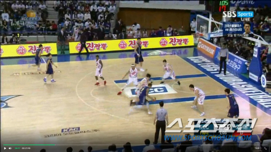 [사진 4]를 보면 정확히 나와 있다. 이승현이 사력을 다해 하승진의 골밑 접근을 막는다. 결국 하승진이 공을 잡는 위치는 최소 림에서 2m 이상 떨어진 지점이다. 포스트 업을 대비해 애런 헤인즈가 도움 수비를 위해 버티고 있다. 자신의 수비수는 버렸다.