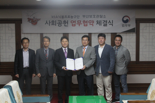 kt 소닉붐(단장 임종택)이 최근 부산 사직실내체육관에서 부산보호관찰소(소장 고영종)와 함께 농구교실 조인식을 체결했다.