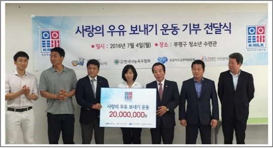 K-MILK 사랑의 국산우유 보내기 운동 기부금 전달식은 지난 4일 오전 11시에 인천시 부평구청소년수련관에서 진행됐고, 전달식에는 한국낙농육우협회 이승호 회장, 홍순철 부회장, 인천지역 아동센터협의회 황미숙 지부장 등이 참석했다.