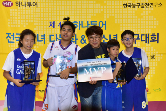 | ◇한국농구발전연구소(소장 천수길)가 주최하고 하나투어가 주관하는 '제4회 하나투어 전국 남녀 다문화&유소년 농구대회'가 10일 서울 배재고 체육관에서 성황리에 종료됐다. 이번 대회는 34개팀, 330여명의 선수가 참가해 역대 최다규모를 기록했다. 이번 대회를 주관한 하나투어 이상진 팀장(가운데)이 대회 종료 후 여학생부 민은기(분당 삼성)와 다문화부 샘 사무엘, 초등 저학년부 김현재, 초등 고학년부 황주안(이상 분당 썬더스)등 각부 MVP와 함께 기념 촬영을 하는 모습. 사진제공=하나투어 |