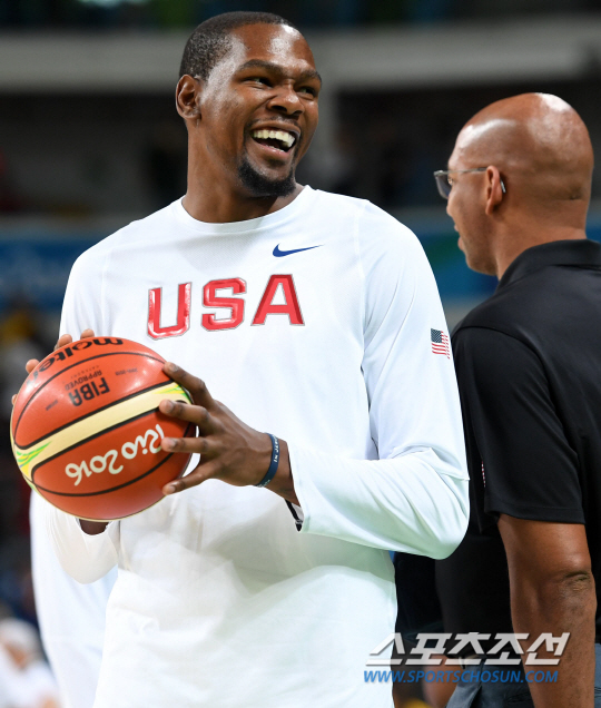 미국 남자 농구대표팀이 12일 오후(현지시간) 브라질 리우데자네이루 바하 카로이카 아레나 1에서 세르비아와 경기를 펼쳤다. 경기 전 워밍업을 하던 케빈 듀란트가 미소를 짓고 있다. /2016.08.12/리우데자네이루=올림픽사진공동취재단 N