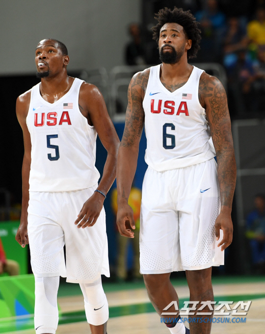 2016 리우올림픽에 출전한 미국 남자 농구대표팀이 12일 오후(현지시간) 브라질 리우데자네이루 바하 카로이카 아레나 1에서 세르비아와 경기를 펼쳤다. 케빈 듀란트(왼쪽)와 디안드레 조던이 심판의 판정에 아쉬운 표정을 짓고 있다. /2016.08.12/리우데자네이루=올림픽사진공동취재단 N