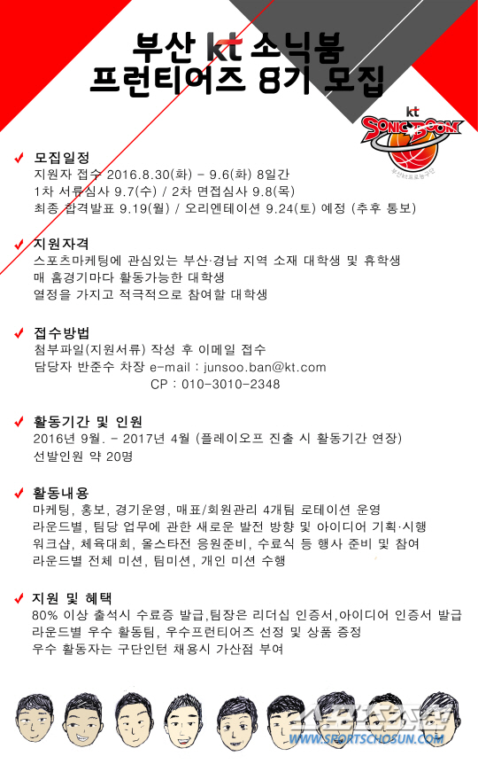 kt 소닉붐이 2016~2017시즌 '프로농구 스포츠 마케팅 현장 체험단(이하 프런티어즈)'을 30일부터 9월 6일까지 8일간 모집한다.