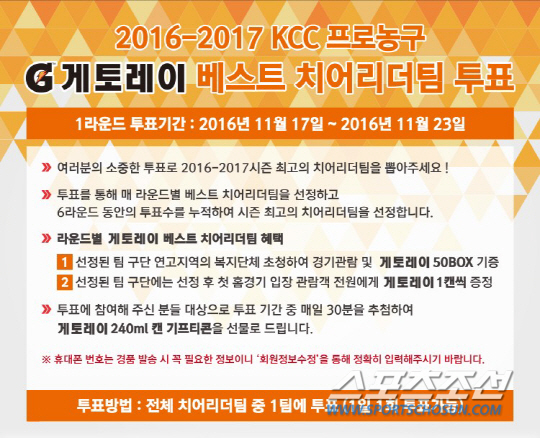 한편 '게토레이 베스트 치어리더 팀' 투표자를 대상으로 투표 기간 중 매일 30명을 추첨하여 게토레이 240㎖ 캔 기프트콘을 증정한다. 라운드별 베스트 치어리더 팀으로 선정된 구단은 이후 첫 홈 경기 입장객 전원에게 게토레이 음료를 증정하며, 해당 구단 연고지 복지 단체에 게토레이 50박스를 기부한다.