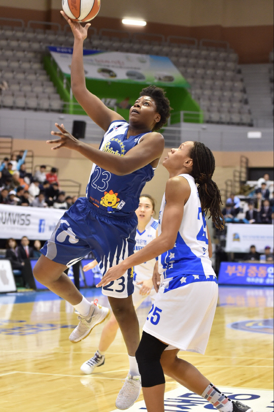 승부처는 4쿼터. 팽팽한 시소게임이 이어졌다. 신한은행 윌리엄즈와 우리은행 존쿠엘 존스가 번갈이 상대 골밑을 계속 파고들었다.