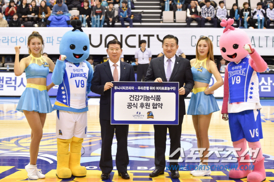 아산 우리은행 위비는 지난 15일 유니시티코리아와 건강기능식품 공식 후원 협약식을 가졌다고 밝혔다. 이날 협약식은 우리은행 농구단 장안호 단장과 유니시티코리아 조경규 상무가 참석한 가운데 아산 이순신실내체육관에서 열렸다.