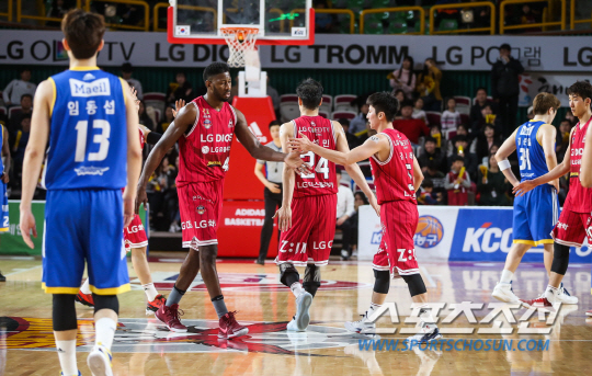| LG 선수들이 17일 삼성에 승리한 뒤 하이파이브를 하고 있다. 사진제공=KBL |