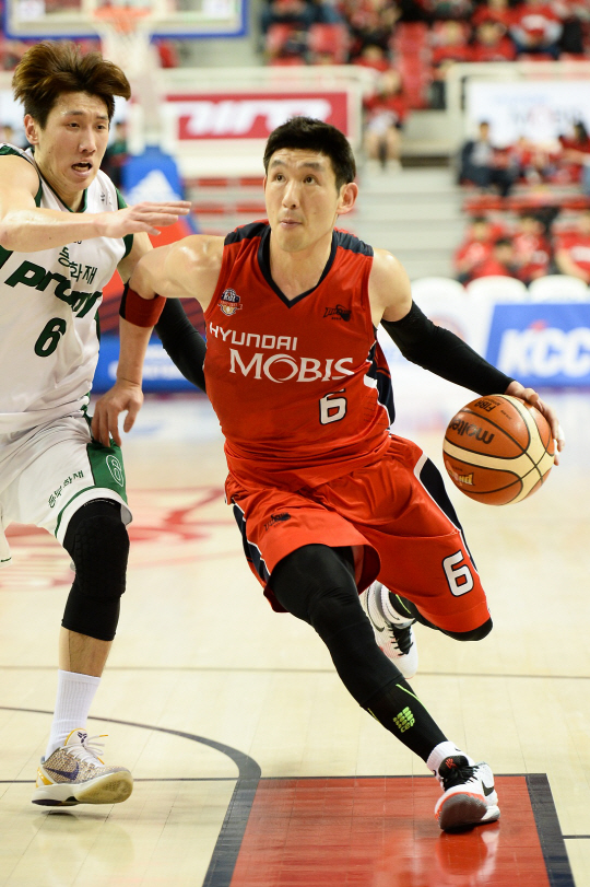 이날 울산에서 열린 6강 PO 첫경기에서 모비스는 75대59로 낙승했다. 양동근은 19점 5어시스트로 팀승리를 견인했다. 경기 리드는 기본이다. 고비마다 3점슛 2개와 득점지원은 물론이고 이대성 김효범 등과 함께 탄탄한 외곽수비로 이날 동부의 3점슛을 경기내내 딱 1개로 막았다. 모비스는 모두 6개의 3점슛을 꽂아넣었다. 이 차이가 승패를 갈랐다.