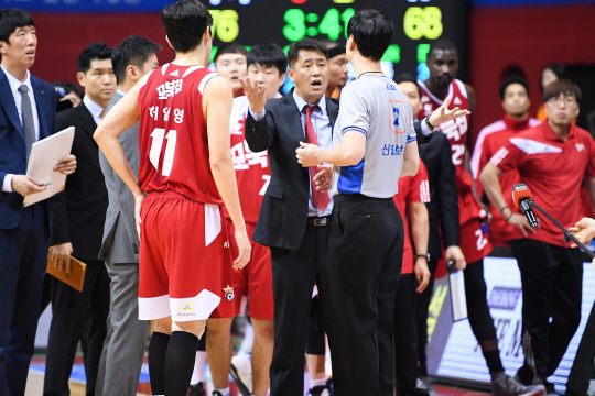 ◇고양 오리온 추일승 감독(가운데)이 지난 6일 고양체육관에서 열린 인천 전자랜드와의 경기 4쿼터 때 테크니컬 파울 경고를 받자 이정협 심판에게 항의하고 있다. 심판진은 명확한 설명을 하지 않고, 이때의 항의를 이유로 추 감독에게 다시 테크니컬 파울을 부과했다. 사진제공=KBL