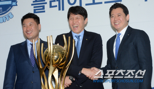 2017-2018 여자프로농구 플레이오프 미디어데이가 8일 서울 양재동 더케이호텔에서 열렸다. 우승 트로피와 함께 포즈를 취한 3팀의 감독들의 모습. 플레이오프 미디어데이에는 우리은행 위성우 감독과 박혜진, KB스타즈 안덕수 감독과 강아정, 신한은행 신기성 감독과 김단비가 참석했다. 양재동=허상욱 기자 wook@sportschosun.com/2018.03.08/