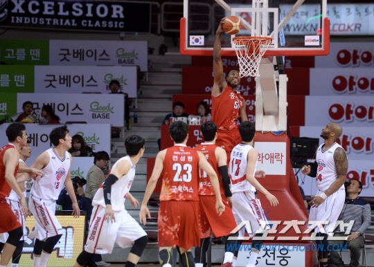 안양 KGC와 울산 현대모비스의 2017-2018 프로농구 6강 플레이오프 4차전이 23일 안양실내체육관에서 열렸다. KGC 사이먼이 덩크를 성공하고 있다. 안양=허상욱 기자 wook@sportschosun.com/2018.03.23/