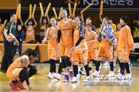 | KB스타즈 선수들이 11일 OK저축은행과의경기서 승리한 뒤 기뻐하고 있다. 사진제공=WKBL |