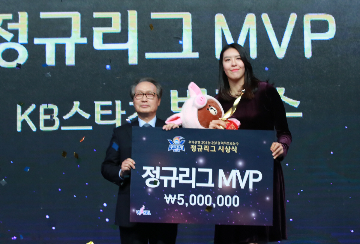 박지수는 "동료들에게 정말 고맙다. 투표해주신 분들께도 감사드린다. 감사할 사람이 정말 많다. 감독님께도 감사하다. 부모님께도 감사하다. 감사한 상"이라며 호호 웃었다.