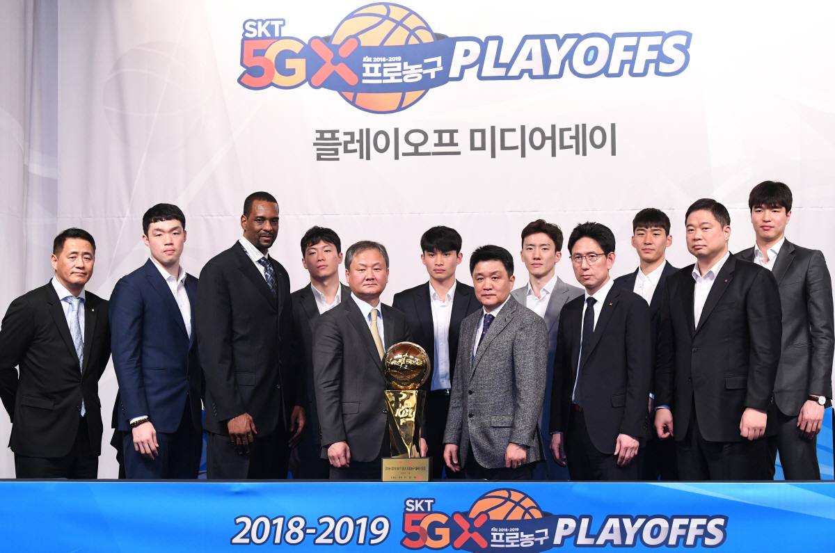 | 21일 서울 청담 리베라호텔에서 2018-19 프로농구 플레이오프 미디어데이 행사가 열렸다. 미디어데이에 참석해 포즈를 취하고 있는 감독과 선수들. 송정헌 기자 songs@sportschosun.com/2019.03.21/ |