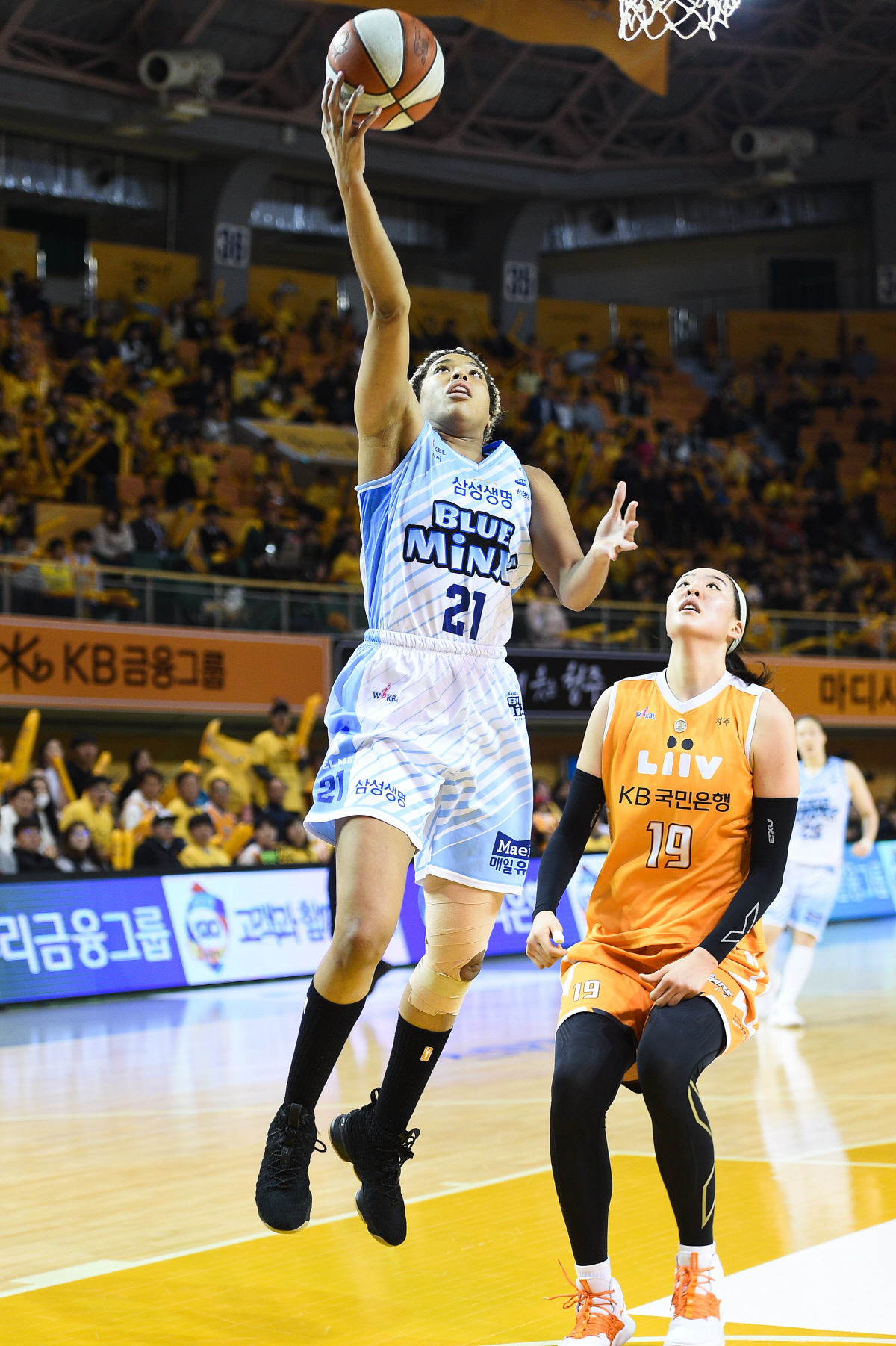 KB는 무려 97득점에 이른 공격도 뛰어났지만 삼성생명의 주포를 막는 수비도 승리의 원동력이 됐다. 우리은행과의 플레이오프를 휘저었던 삼성생명 김한별을 12득점으로 묶은 것이 컸다. 김한별은 플레이오프 3차전에서 당한 코뼈 부상의 후유증에다 체력 고갈, 그리고 마크맨 강아정의 강한 압박과 순간적인 협력수비에 완벽한 득점 찬스를 잘 잡아내지 못하며 2점포 성공률이 25%에 그칠만큼 좋지 못했다. 주 득점원인 박하나 역시 7개의 3점슛 시도에 2개만 성공할만큼 감각이 좋지 못했다. 경기 감각은 괜찮았지만, 3차전까지 혈전으로 치러낸 플레이오프의 후유증이 커 보였다. 이주연과 윤예빈 등 플레이오프나 정규시즌에서 큰 힘을 보탰던 신예들이 챔프전이라는 큰 무대의 중압감을 이겨내지 못한 것도 대량 실점의 원인이 됐다. 다만 베테랑 김보미가 2쿼터에서 고비 때마다 3점포 4방으로 큰 힘을 보탰고, 플레이오프에서 기대에 미치지 못했던 하킨스가 3쿼터 내외곽을 휘저으며 18득점 등 총 26득점으로 제 역할을 해낸 것은 그나마 2차전을 기대케 하는 요소가 됐다.