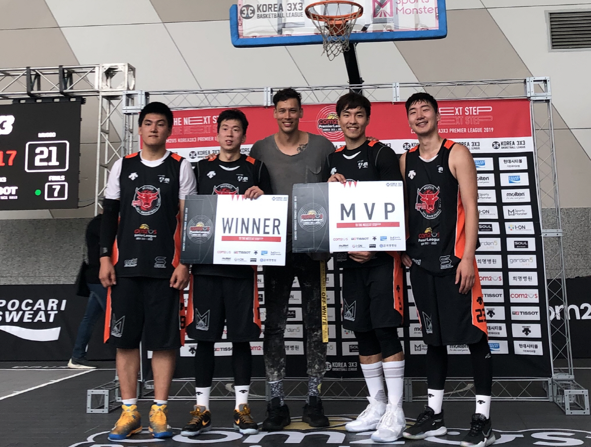 ◇컴투스 KOREA 3X3 프리미어리그 2019 5라운드 우승을 차지한 무쏘 선수들이 기념촬영을 하고 있다. 사진제공=한국3x3농구연맹