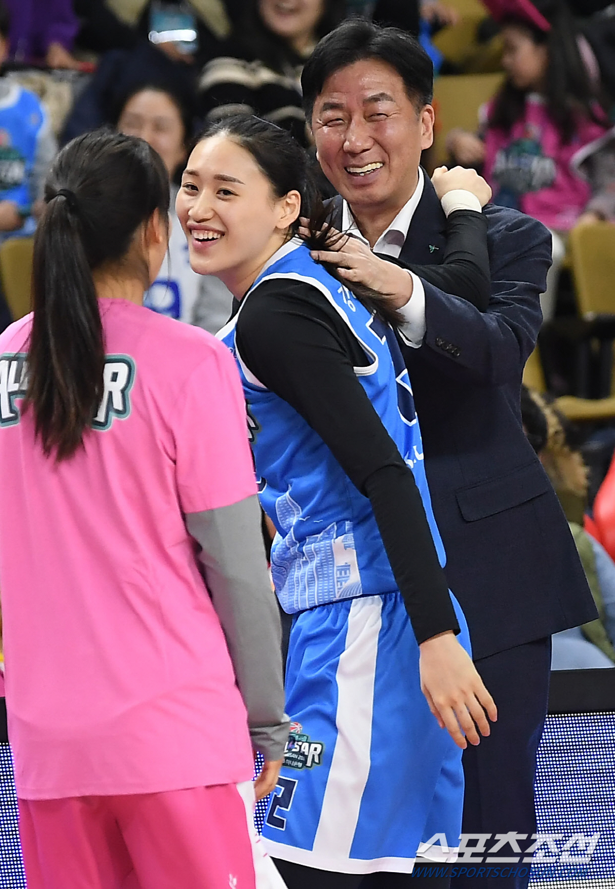 2019-2020 여자프로농구 올스타전이 12일 오후 부산 BNK센터에서 열렸다. 3점슛 대회에서 우승을 차지한 강이슬이 이훈재 감독과 함께 기뻐하고 있다. 부산=박재만 기자 pjm@sportschosun.com/2020.01.12/