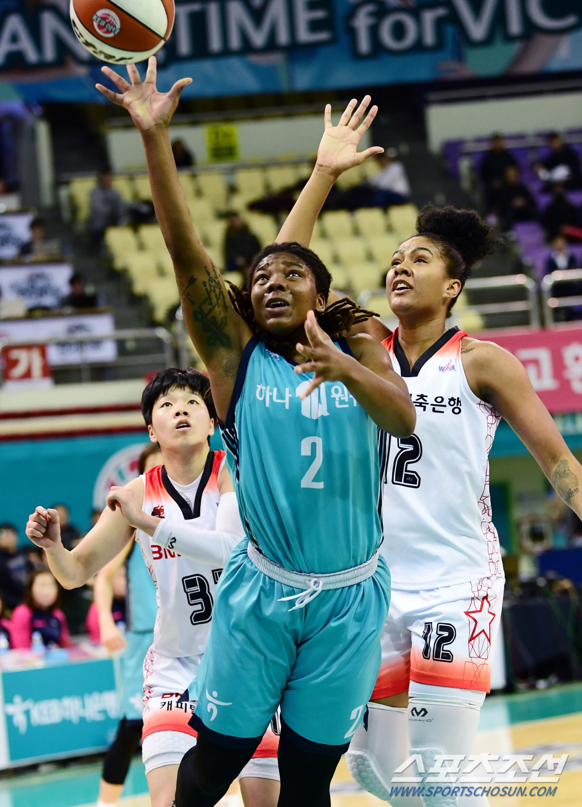 2019-2020 여자프로농구 KEB하나은행과 BNK썸의 경기가 8일 부천실내체육관에서 열렸다. KEB하나은행 마이샤가 BNK썸 단타스의 수비 사이로 레이업 슛을 시도하고 있다. 부천=최문영 기자 deer@sportschosun.com /2020.01.08/