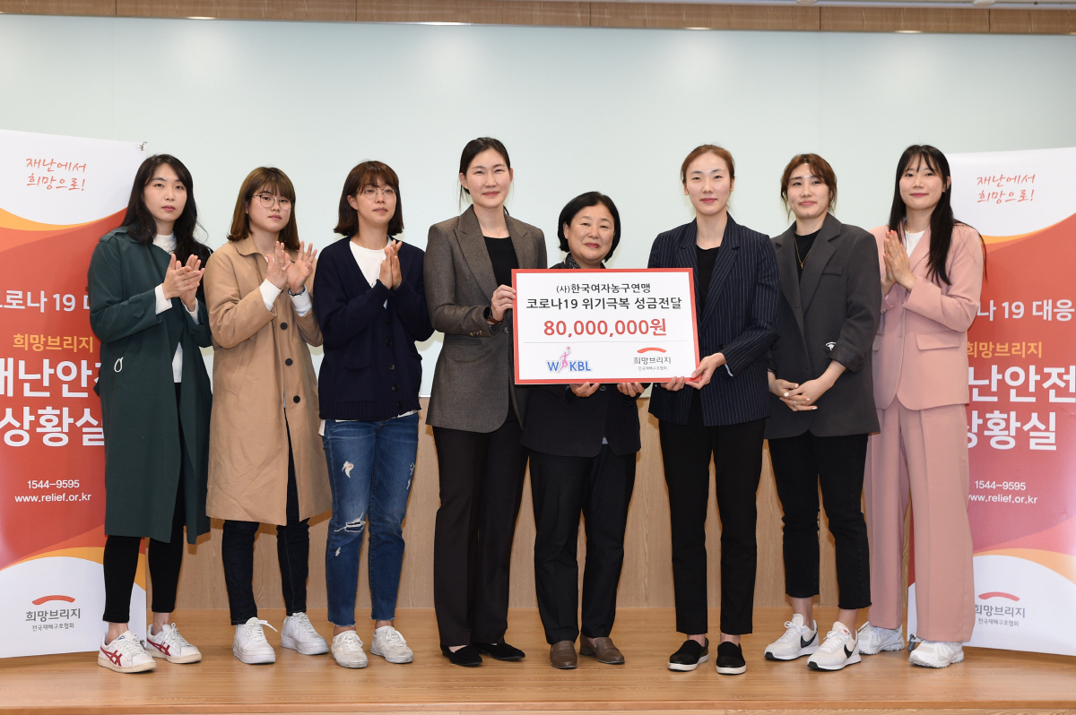 이날 전달식에는 박정은 WKBL 경기운영본부장을 비롯해 박혜진(아산 우리은행) 박하나(용인 삼성생명) 이경은(인천 신한은행) 백지은(부천 하나은행) 강아정(청주 KB스타즈) 이소희(부산 BNK) 등 6개 구단을 대표하는 선수들이 희망브리지 전국재해구호협회를 직접 방문했다.