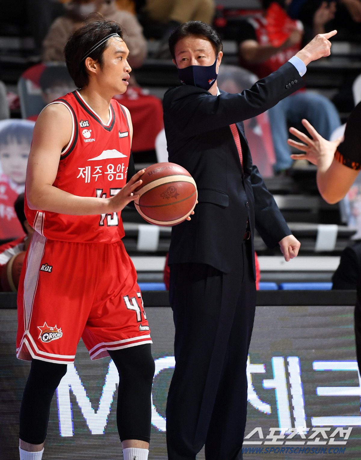 고양 오리온과 창원 LG의 2020-2021 프로농구 경기가 19일 고양체육관에서 열렸다. 오리온 강을준 감독이 이대성에게 작전지시를 하고 있다. 고양=허상욱 기자 wook@sportschosun.com/2020.10.19/