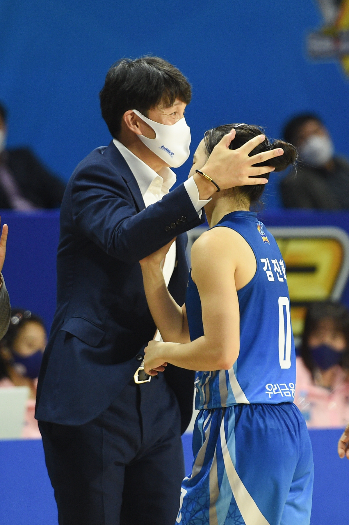 위 감독은 벤치에서 '우와~'라고 탄성을 지른 뒤 '아빠 미소'를 지었다. 게다가 벤치로 돌아오는 김진희를 그대로 안으며 함박웃음을 지었다.