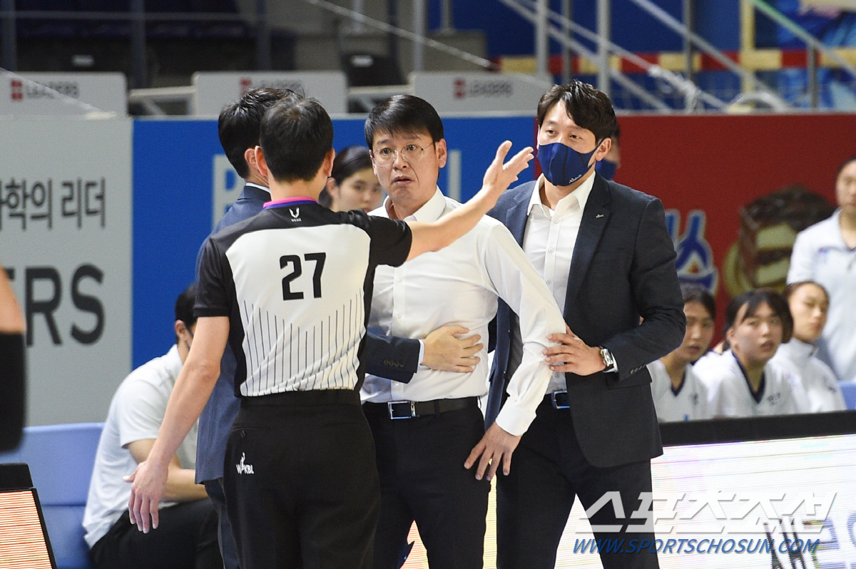 정상일 신한은행 감독이 3일 용인실내체육관서 열린 삼성생명전에서 심판 콜에 거칠게 항의하다 퇴장당하고 있다. 올 시즌 1호이자, 지난 2017년 11월 22일 임근배 삼성생명 감독 이후 3년여만의 감독 퇴장이다. 사진제공=WKBL
