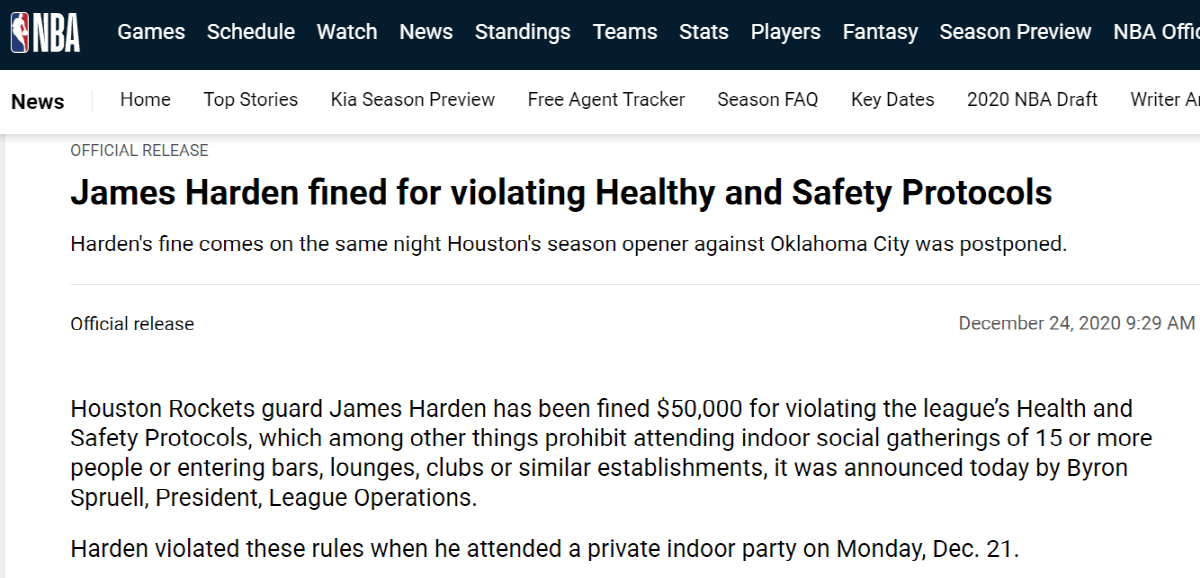 한편, NBA는 2020~2021시즌 개막 이틀 만에 코로나19 직격탄을 맞았다. NBA는 '텍사스주 휴스턴에서 열릴 예정이던 휴스턴 로키츠와 오클라호마시티 선더의 경기를 연기하기로 했다'고 발표했다. 휴스턴은 총 16명의 선수를 보유하고 있는데 이 가운데 7명이 코로나19 검사 중이거나 자가 격리 조치됐다. 1명은 부상으로 출전할 수 없다. 게다가 하든이 규정 위반으로 경기에 뛸 수 없게 돼 가용 인원이 7명으로 줄었다. 휴스턴은 NBA 경기가 성립할 수 있는 최소 선수 수인 8명을 맞추지 못했다.