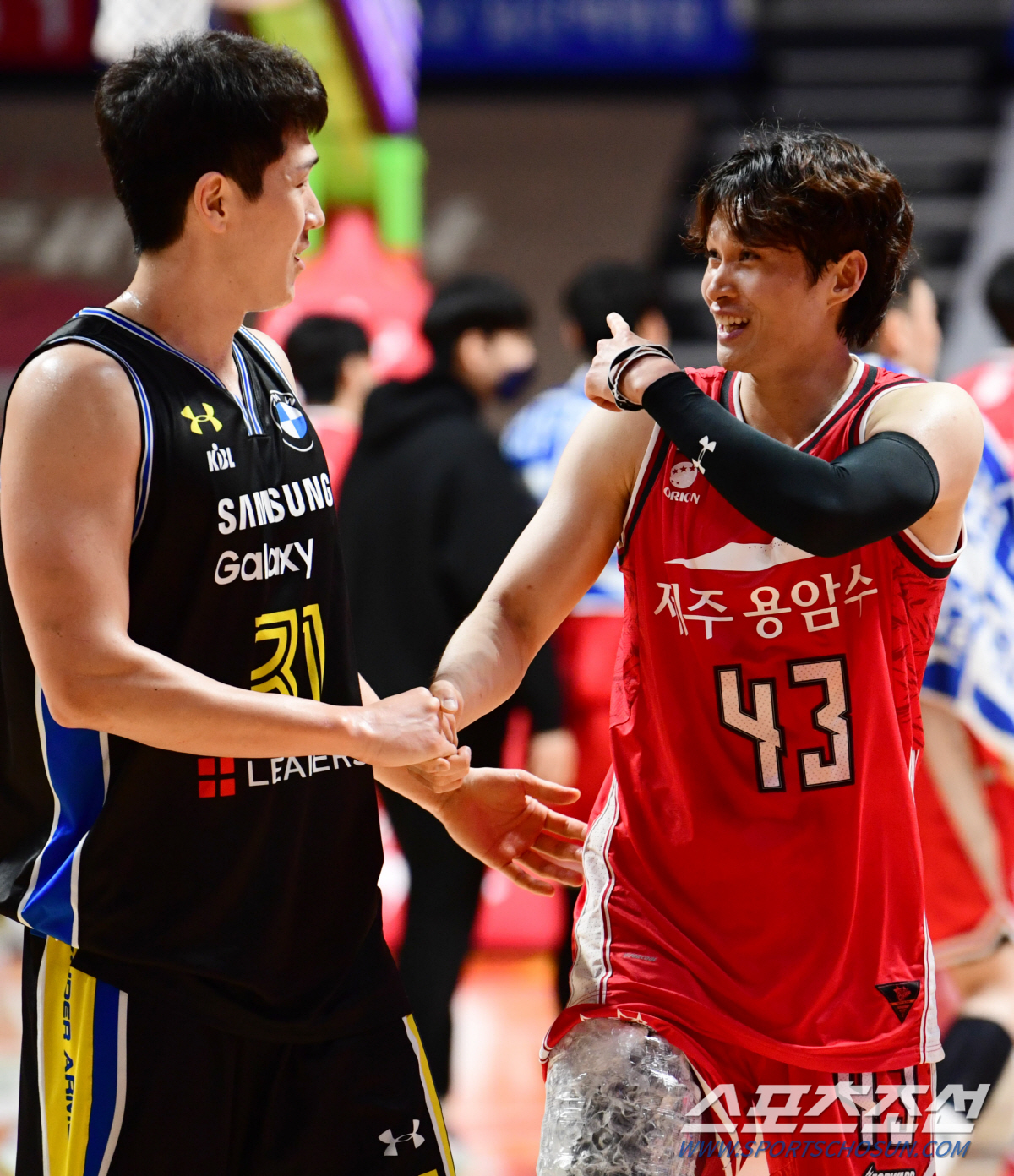 '패자를 향한 따뜻한 손길' 이대성이 삼성을 상대로 대승을 거둔 후 김준일에게 위로를 건네고 있다.