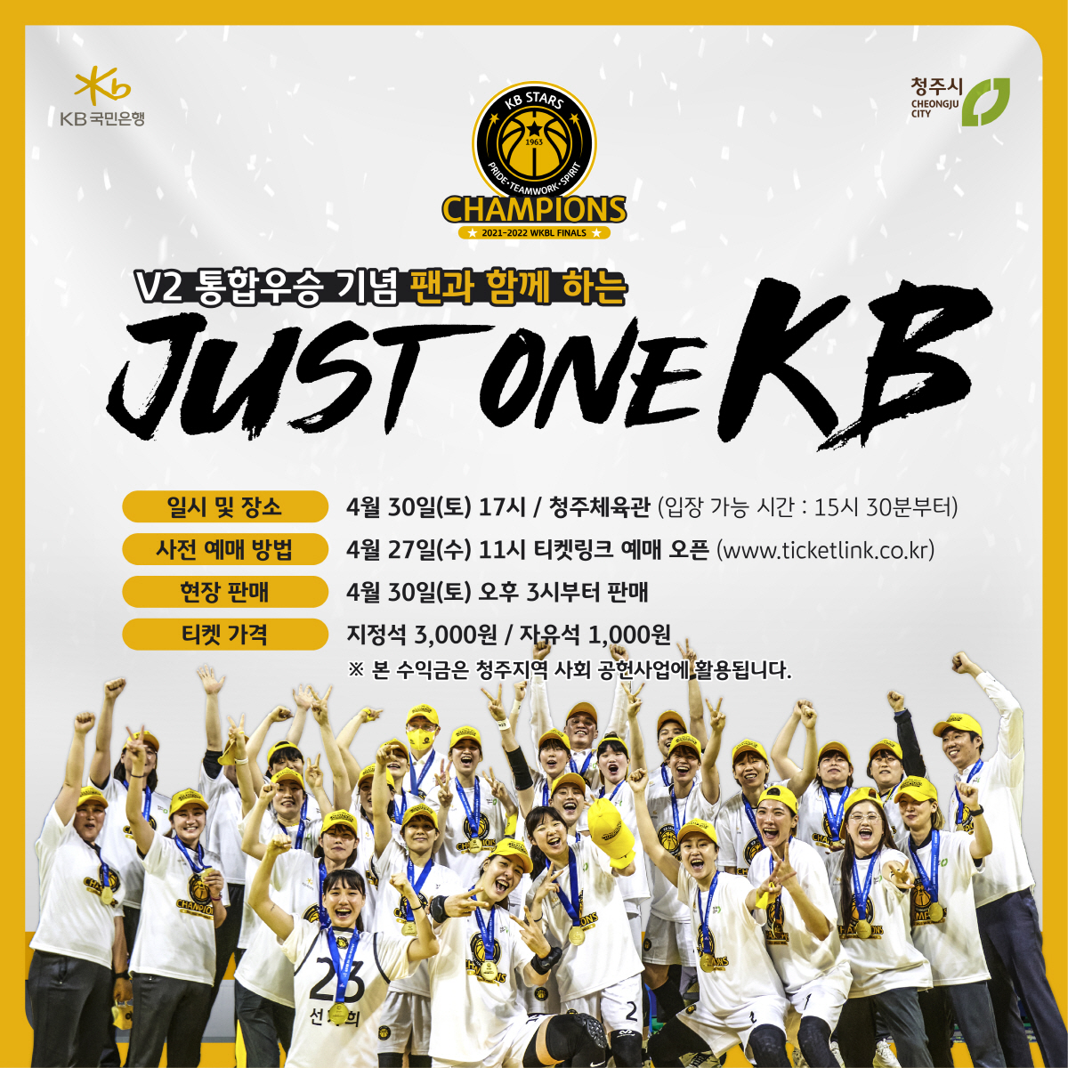 2021~2022시즌 여자 프로농구 통합 챔피언에 오른 KB스타즈가 홈구장 청주체육관으로 금의환향하며 V2 통합우승 기념 '팬과 함께하는 JUST ONE KB'를 개최한다.