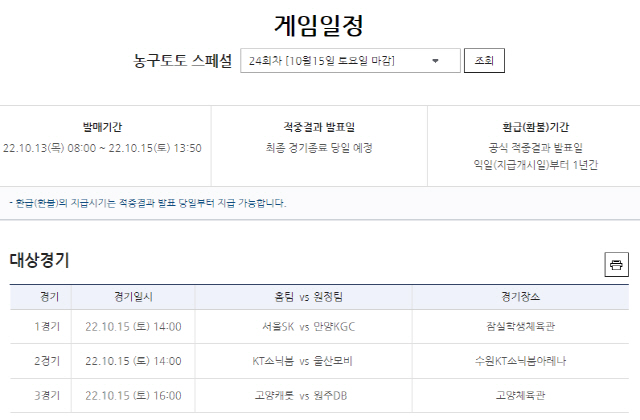 15일 오후 2시에 열리는 서울 SK-안양 KGC전과 수원 KT-울산 현대모비스전을 비롯해 같은 날 오후 4시에 펼쳐지는 고양 캐롯-원주 DB전을 대상으로 발행되는 농구토토 스페셜 24회차는 13일 오전 8시부터 1경기 시작 10분 전인 15일 오후 1시 50분까지 게임에 참여할 수 있다.