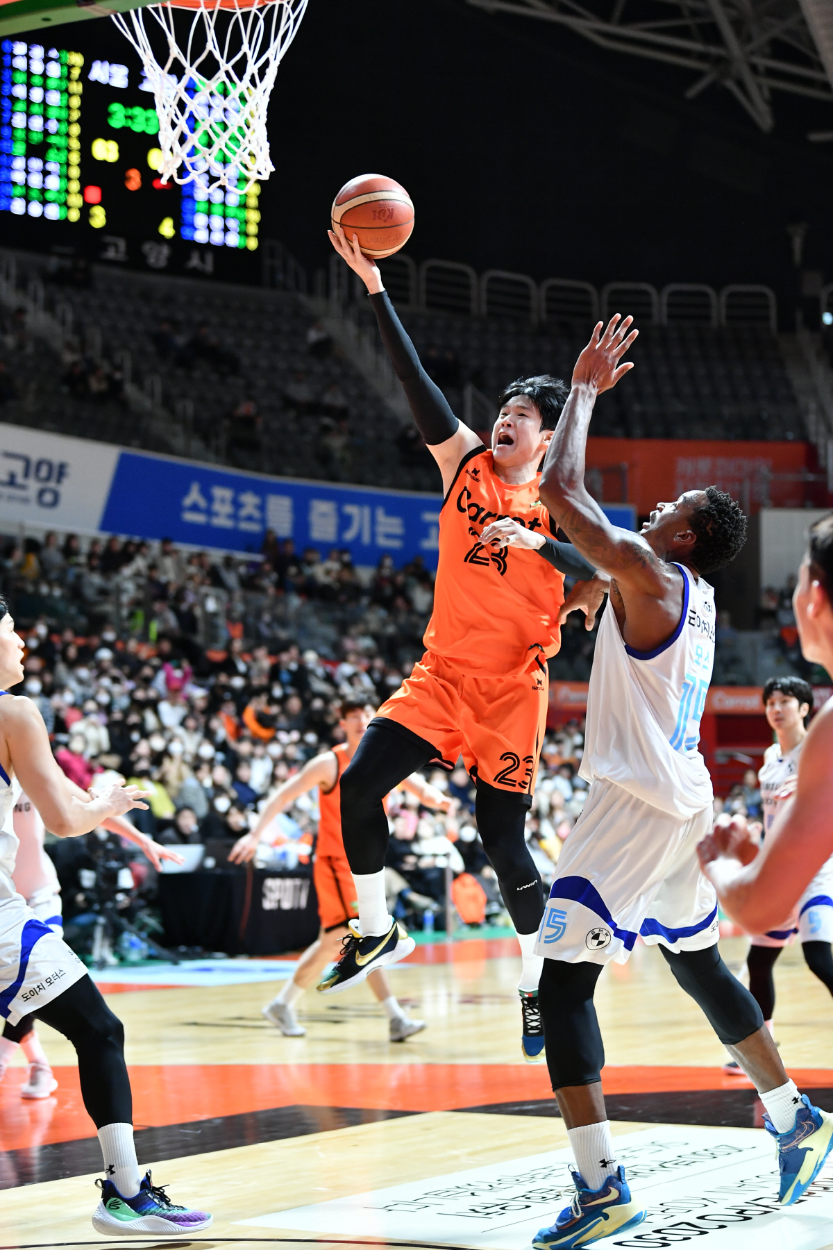 수비적인 흐름이 이어질 듯 했지만, 막상 경기는 수비전 보다는 화끈한 공격전이었다. 캐롯은 전가의 보도인 3점포를 4개나 가동했다. 삼성도 기세에서 밀리지 않았다. 다랄 윌리스가 상대의 취약 포인트인 골밑을 집중공략해 10점을 뽑아냈다. 신동혁도 3점슛 2개로 8득점. 1쿼터는 불꽃이 튀었다. 31-27로 캐롯이 약간 앞섰다.