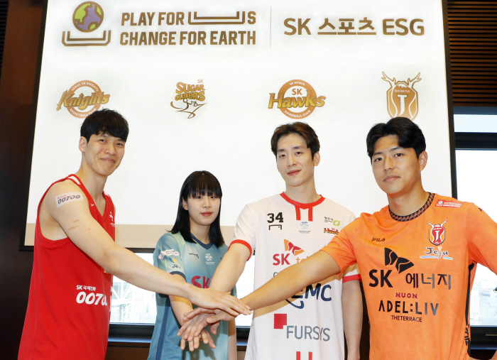 SK는 23일 서울 서린빌딩에서 4개 스포츠 구단 관계자와 대표 선수들이 참석한 가운데 친환경, 지역 사회 공헌, 지속 가능한 성장을 위한 다양한 활동을 담은 '스포츠 ESG' 캠페인을 공동 추진하기로 했다. ESG 슬로건은 '플레이 포 어스, 체인지 포 어스(Play for Us, Change for Earth)'다.