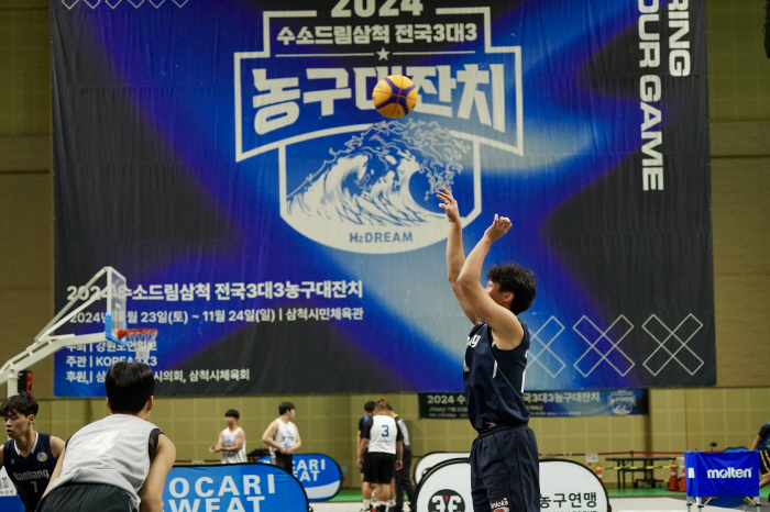 강원도 삼척시민체육관에서 23일부터 24일까지 개최된 2024 수소드림삼척 전국3대3농구대잔치에 참가한 선수가 점퍼슛을 날리고 있다. KOREA3X3 제공
